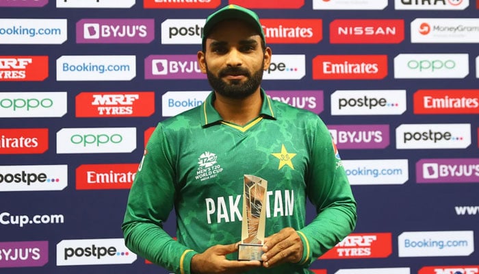 Pakistan’s Asif Ali poses with the Man of the Match trophy after the ICC Men’s T20 World Cup 2021 match against Afghanistan at the Dubai International Cricket Stadium on October 29, 2021. — ICC