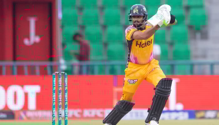 Peshawar Zalmi captain Babar Azam plays a shot during the Pakistan Super League (PSL) 11 campaign opener against Rawalpindis at Gaddafi Stadium in Lahore on March 28, 2026. — PSL