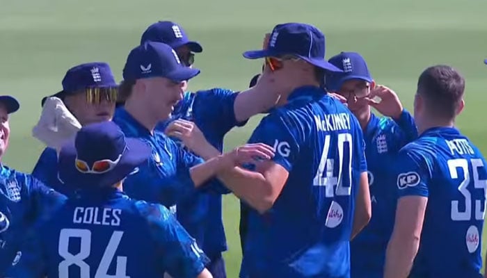 England Lions’ Matthew Potts (right) celebrates taking a wicket with teammates during the first ODI against Pakistan Shaheens at the Saeed Cricket Stadium in Abu Dhabi on February 27, 2026. — Screengrab via livestream