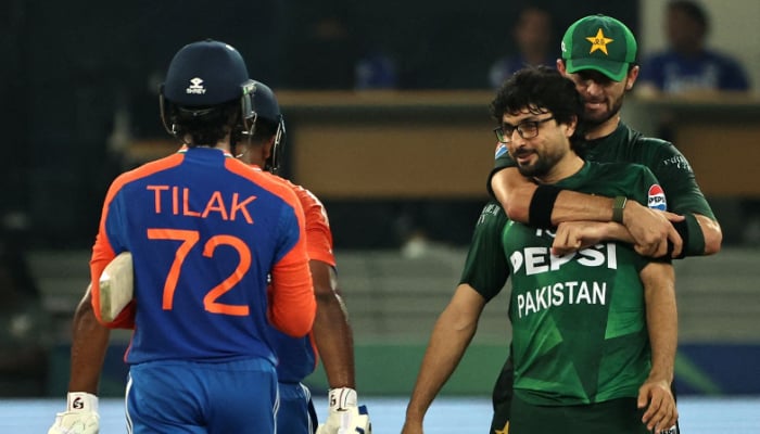 Abrar Ahmed (2R) celebrates with his teammate Shaheen Shah Afridi after taking the wicket of India’s Sanju Samson during the Asia Cup 2025 Final Twenty20 International cricket match between India and Pakistan at the Dubai International Stadium on September 28, 2025 in Dubai. – AFP