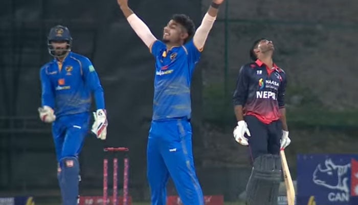 UAE’s Muhammad Zuhaib (centre) celebrates taking a wicket during the first T20I against Nepal at the Tribhuvan University International Cricket Stadium in Kirtipur on April 20, 2026. — Screengrab via livestream