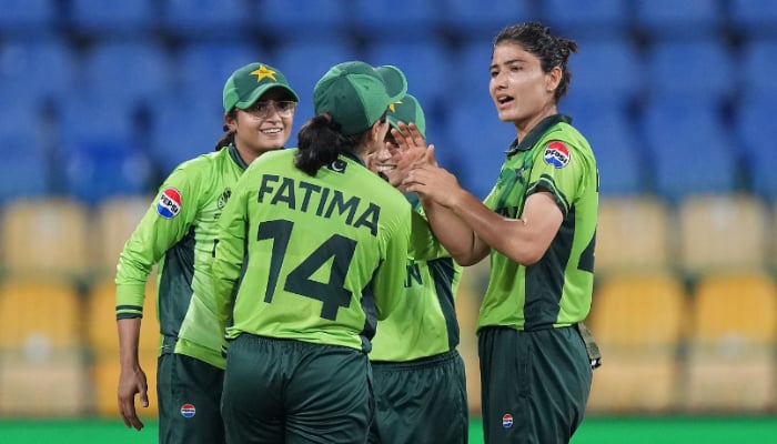 R. in Colombo, Sri Lanka on October 21, 2025. Pakistan’s Ramim Shamim (left) celebrates with Fatima Sana (centre) and Diana Baig (right) after running out Annie Derksen (not pictured) during the ICC Women’s Cricket World Cup 2025 match against South Africa at the Premadasa Stadium. – ICC