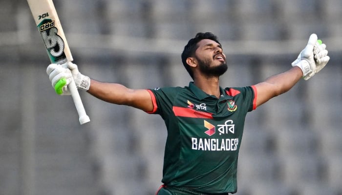 Tanzid Hasan Tamim of Bangladesh celebrates after scoring a century (100 runs) during the third One Day International (ODI) cricket match between Bangladesh and Pakistan at the Sher-e-Bangla National Stadium in Mirpur on March 15, 2026.