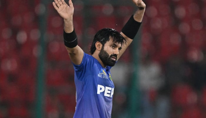 Mohammad Rizwan acknowledges the crowd as he celebrates scoring a century (100 runs) during the Pakistan Super League (PSL) Twenty20 cricket match between Karachi Kings and Multan Sultans at the National Stadium in Karachi on April 12, 2025. — AFP