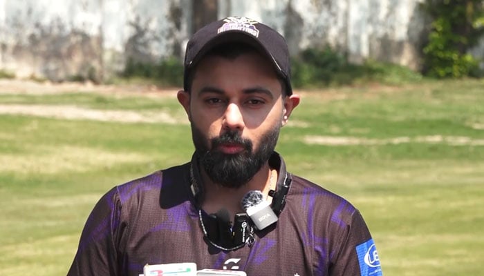 Quetta Gladiators captain Saud Shakeel addresses the media at the LCCA Stadium in Lahore on March 24, 2026. — PCB