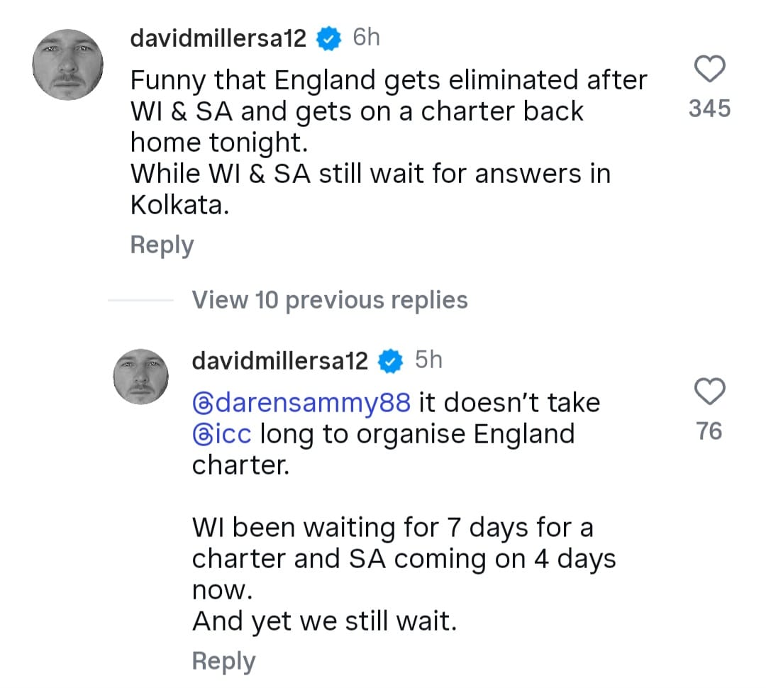 “It’s funny that England get knocked out after WI & SA and come back home tonight. WI & SA are still waiting for answers in Kolkata,” noted Miller.