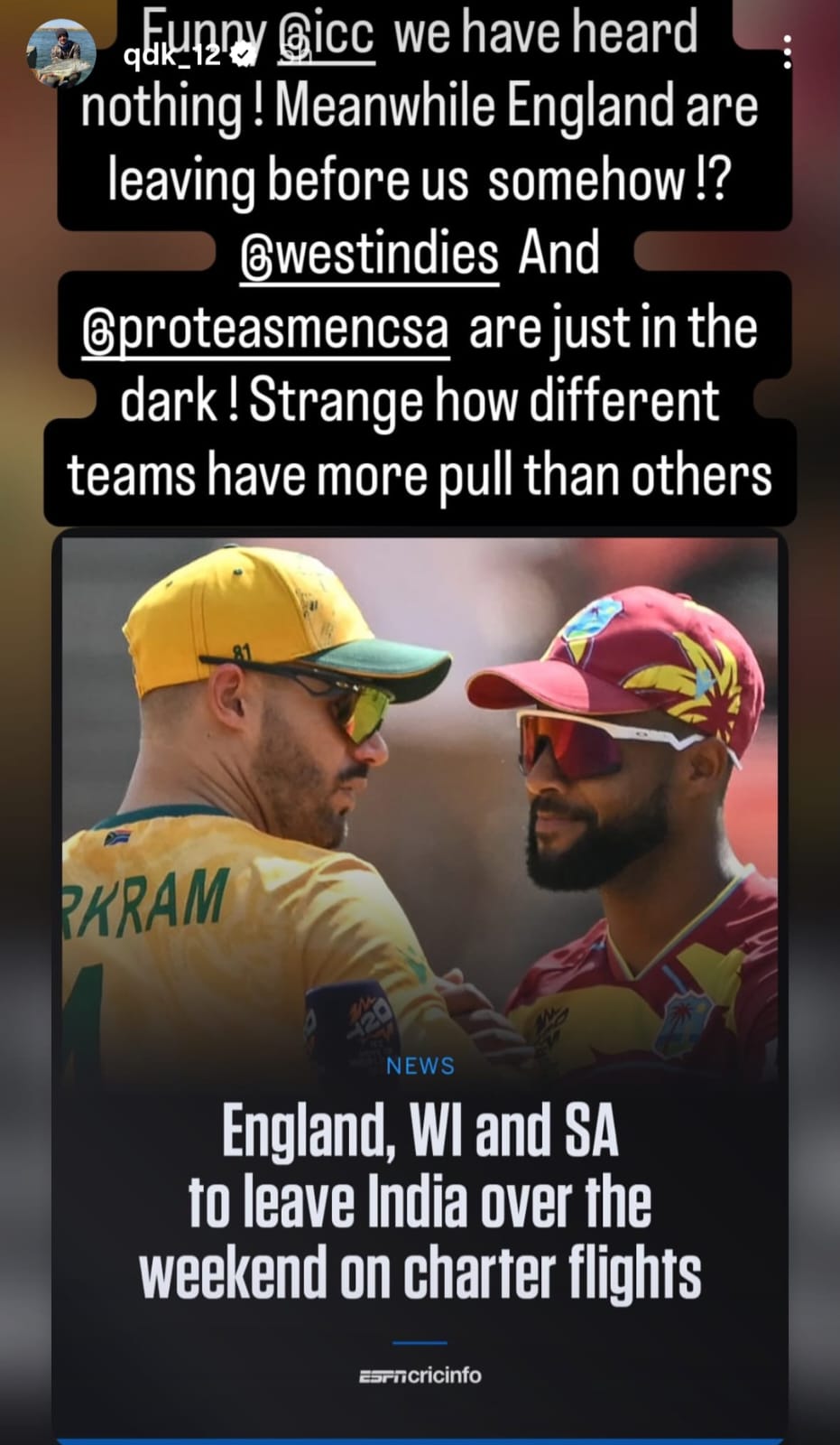 “Funny @icc, we haven’t heard anything! Meanwhile, England are somehow out before us?” De Kock wrote. “@westindies and @proteasmencsa are in the dark
