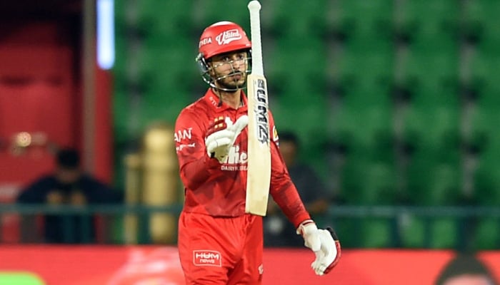 Islamabad United opener Sameer Minhas celebrates scoring a fifty during the Pakistan Super League (PSL) match against Rawalpindi at Gaddafi Stadium in Lahore, Pakistan on April 4, 2026. — PCB