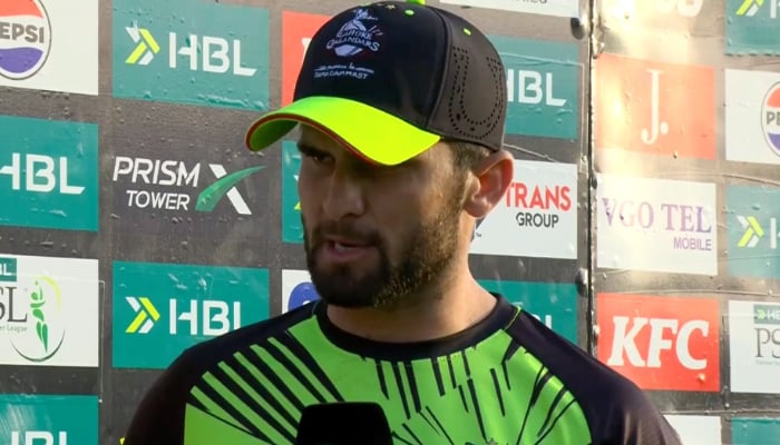 Lahore Qalandars captain Shaheen Afridi speaks during the post-match presentation after losing to Peshawar Zalmi during the Pakistan Super League (PSL) 11 match at the National Bank Stadium in Karachi on April 11, 2026. — Screengrab/Livestream