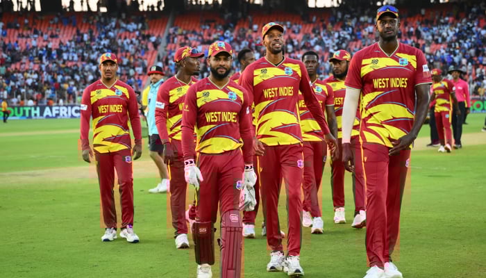 West Indies players leave the field after the ICC Men’s T20 World Cup 2026 Super Eight match against South Africa at the Narendra Modi Stadium on February 26, 2026 in Ahmedabad, India. – ICC